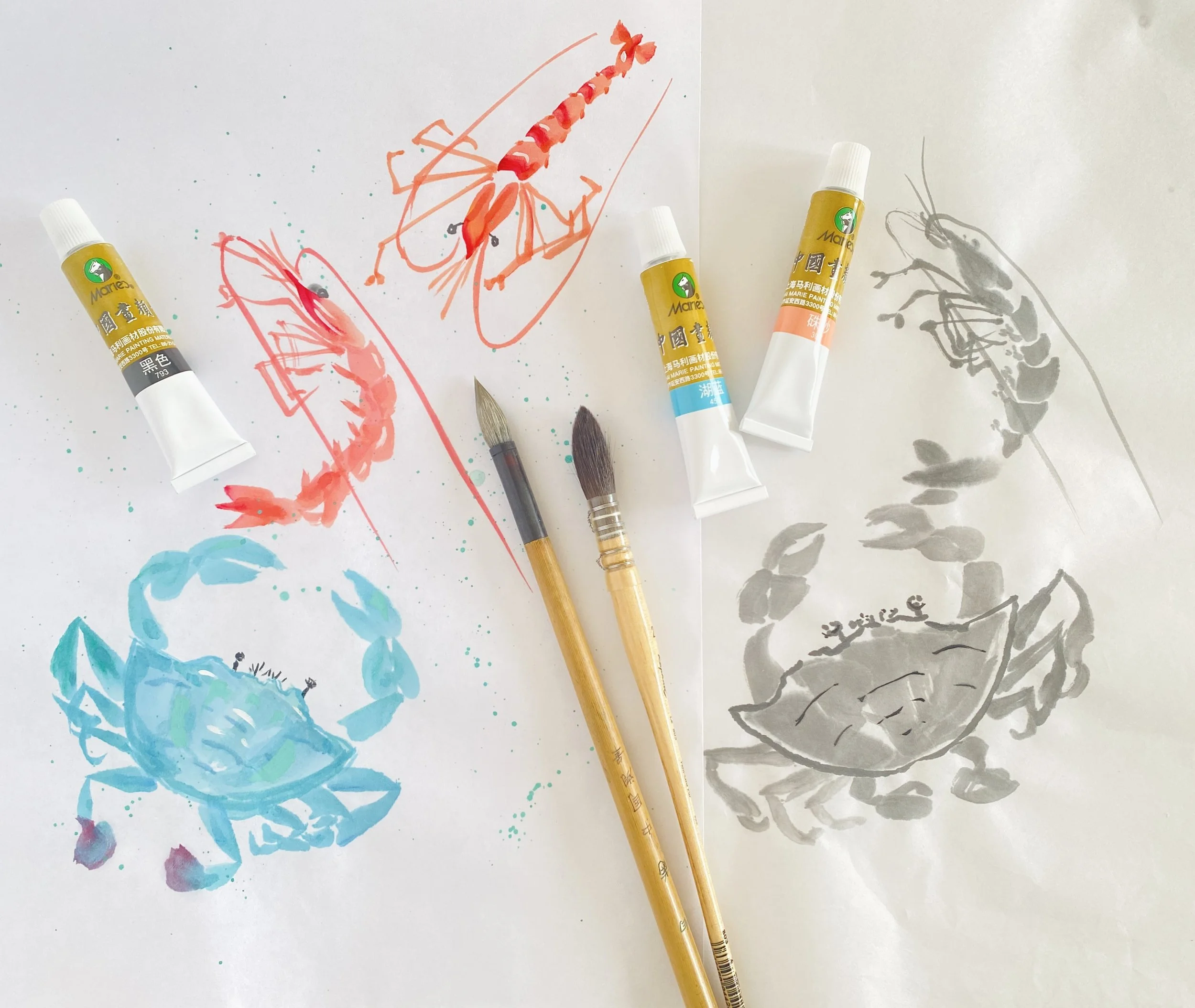 In this article I share the fun of painting with Asian brushes and Chinese watercolors to create a whimsical shrimp and crab artwork. This workshop was inspired by the book about Chinese Brush Painting by author Danny Han-Lin Chen.